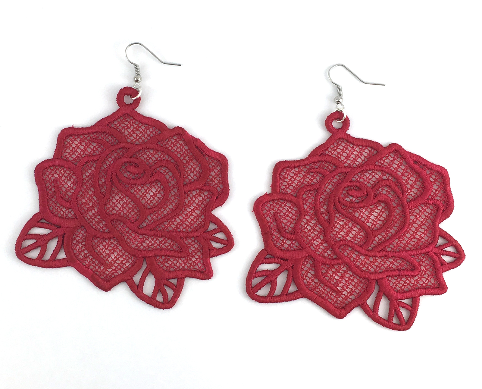 Orecchini in pizzo, bellissime rose curate nel dettaglio, eleganti e delicate, per le ragazze più romantiche. Sono perfetti da indossare in qualsiasi situazione, stagione e abbigliamento. Gli orecchini sono ricamati a macchina con filo di ottima qualità in 100% viscosa, che li rende molto lucente.