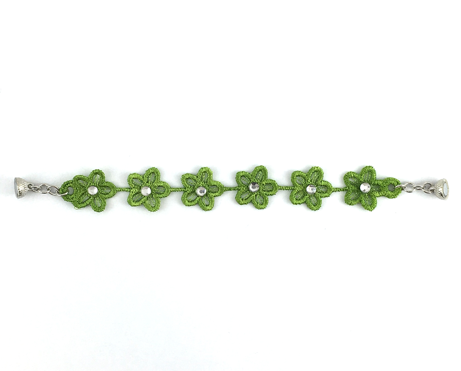 Bracciale in pizzo, realizzato con 6 fiorellini uniti con il tessuto, molto fine e delicato, adatto da indossare tutti i giorni. Questo modello è pensato per le bambine che vogliono indossare gioielli!